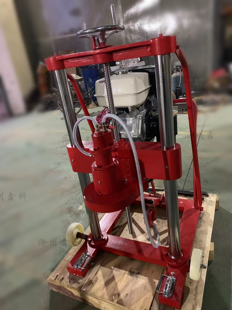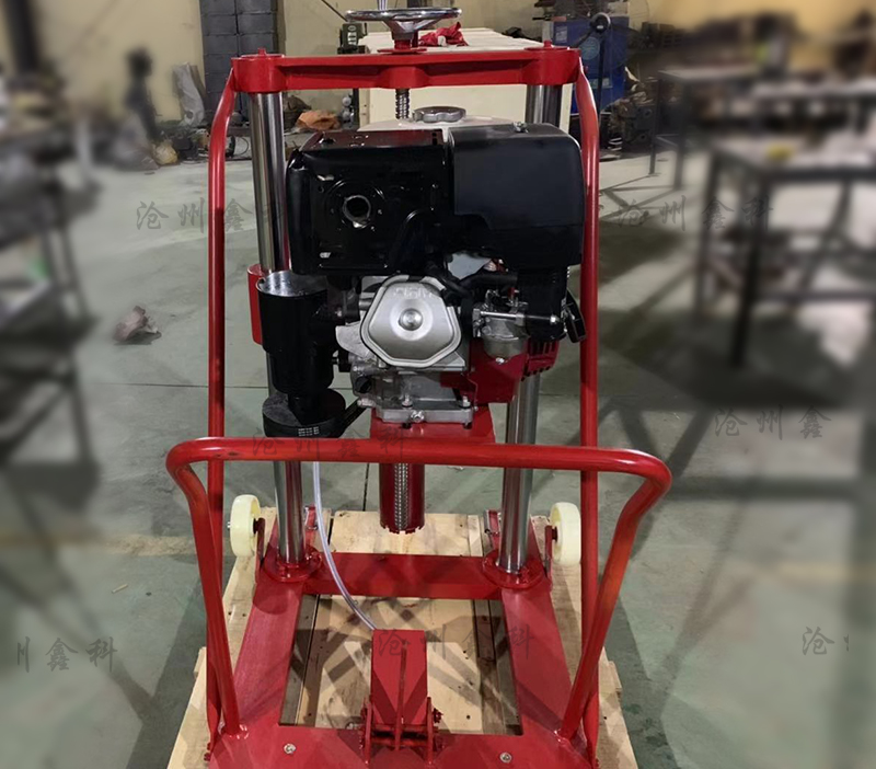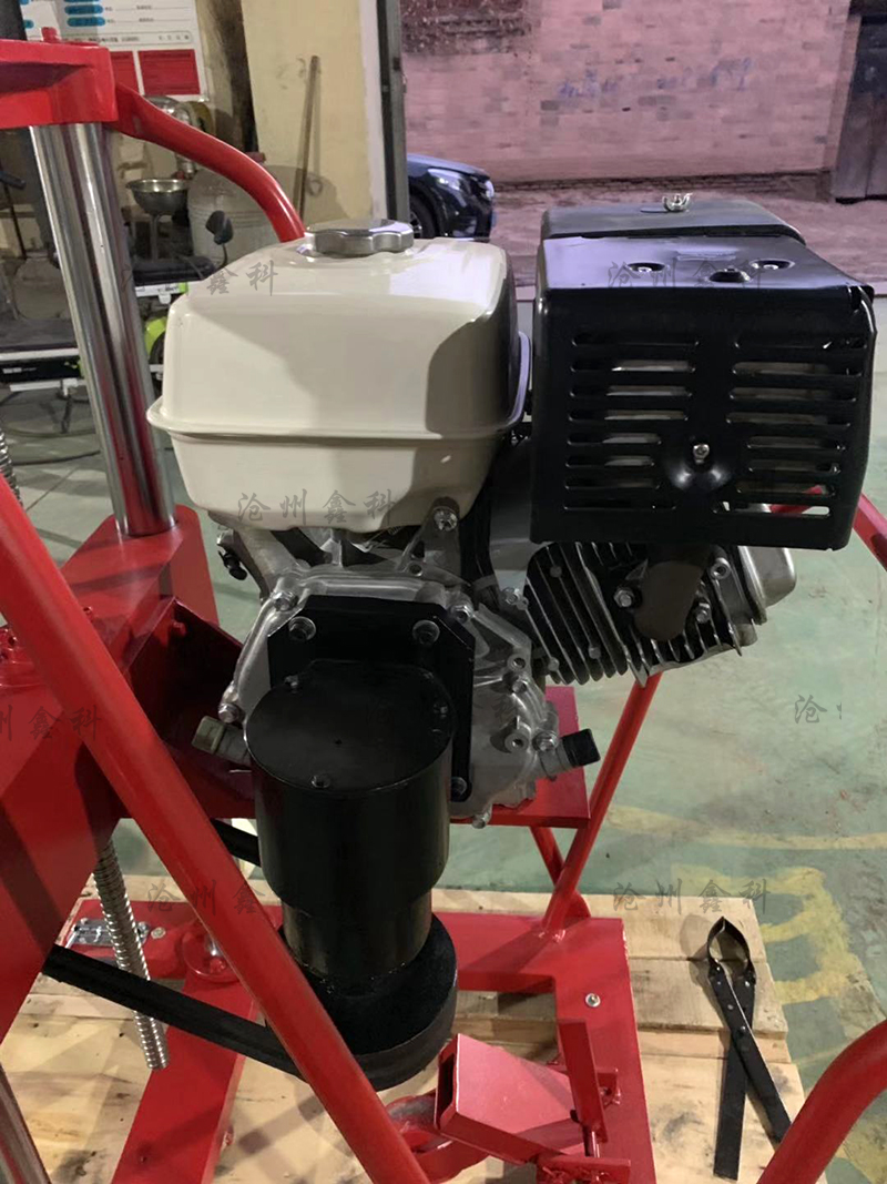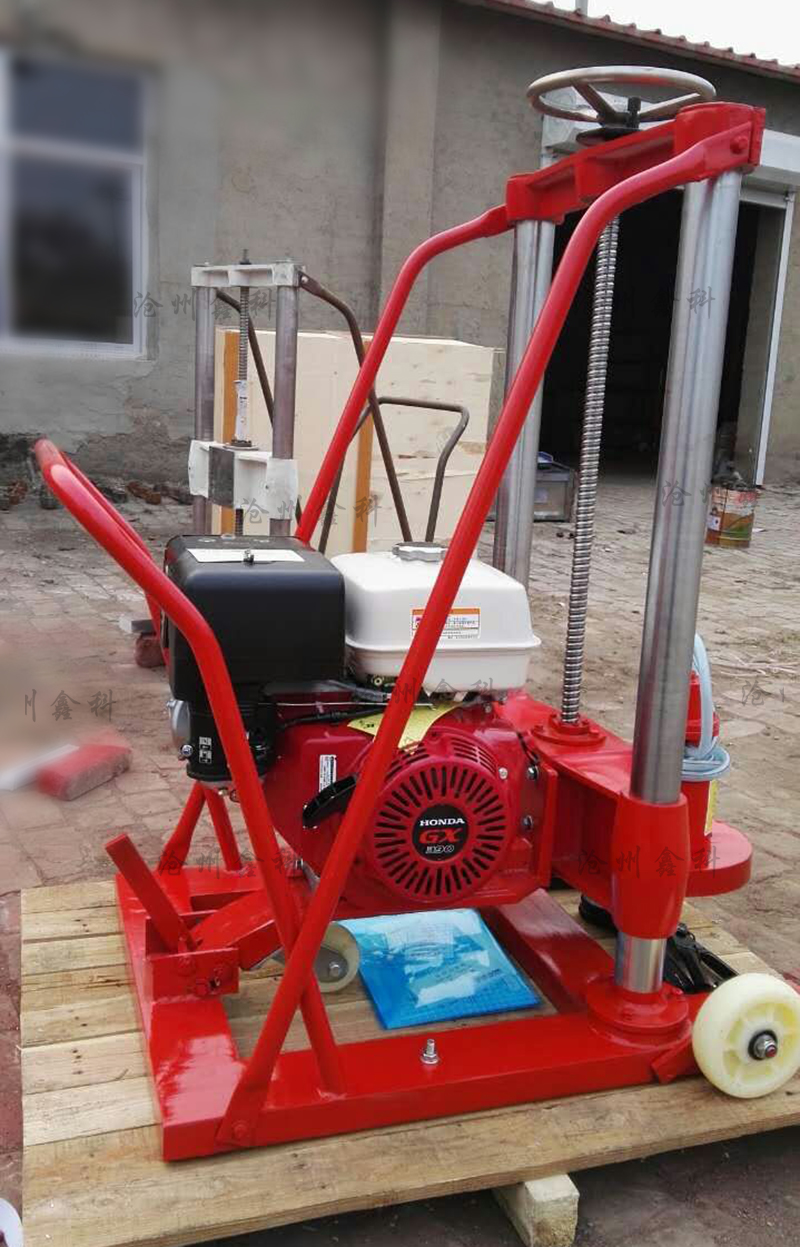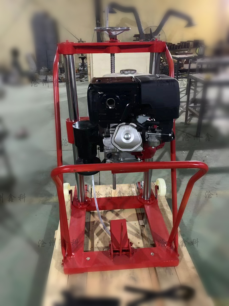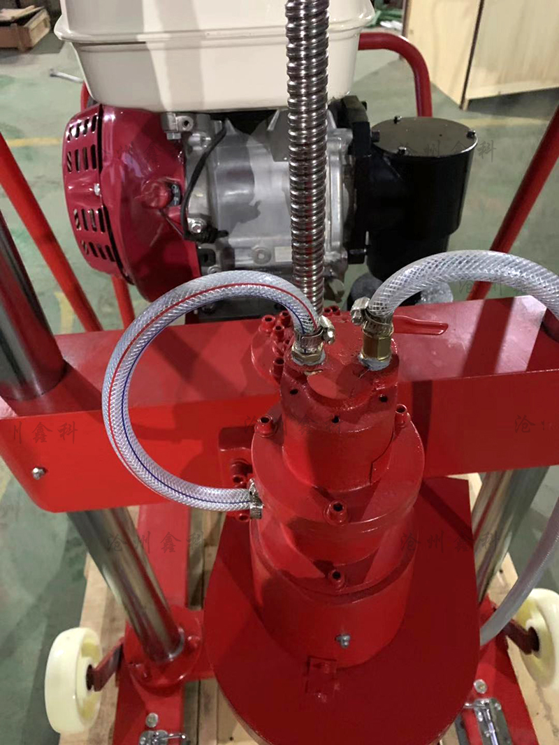 5、開孔:以上作業(yè)做好后,即可開孔作業(yè),裝上鉆頭,起動汽油機(詳情見汽油機用戶手冊)把進水管放入水桶內(nèi),水桶要提到高出水泵位置,然后手捏氣襄把水吸入水泵,水泵上水后把水桶放在地面即可。油門調(diào)至z大,開始輕搖給進手柄,使鉆頭緩慢接觸地面。開孔要訣:先給水后鉆進,給進速度要慢,鉆壓要小。嚴禁無水作業(yè),以免燒壞鉆頭和水封。